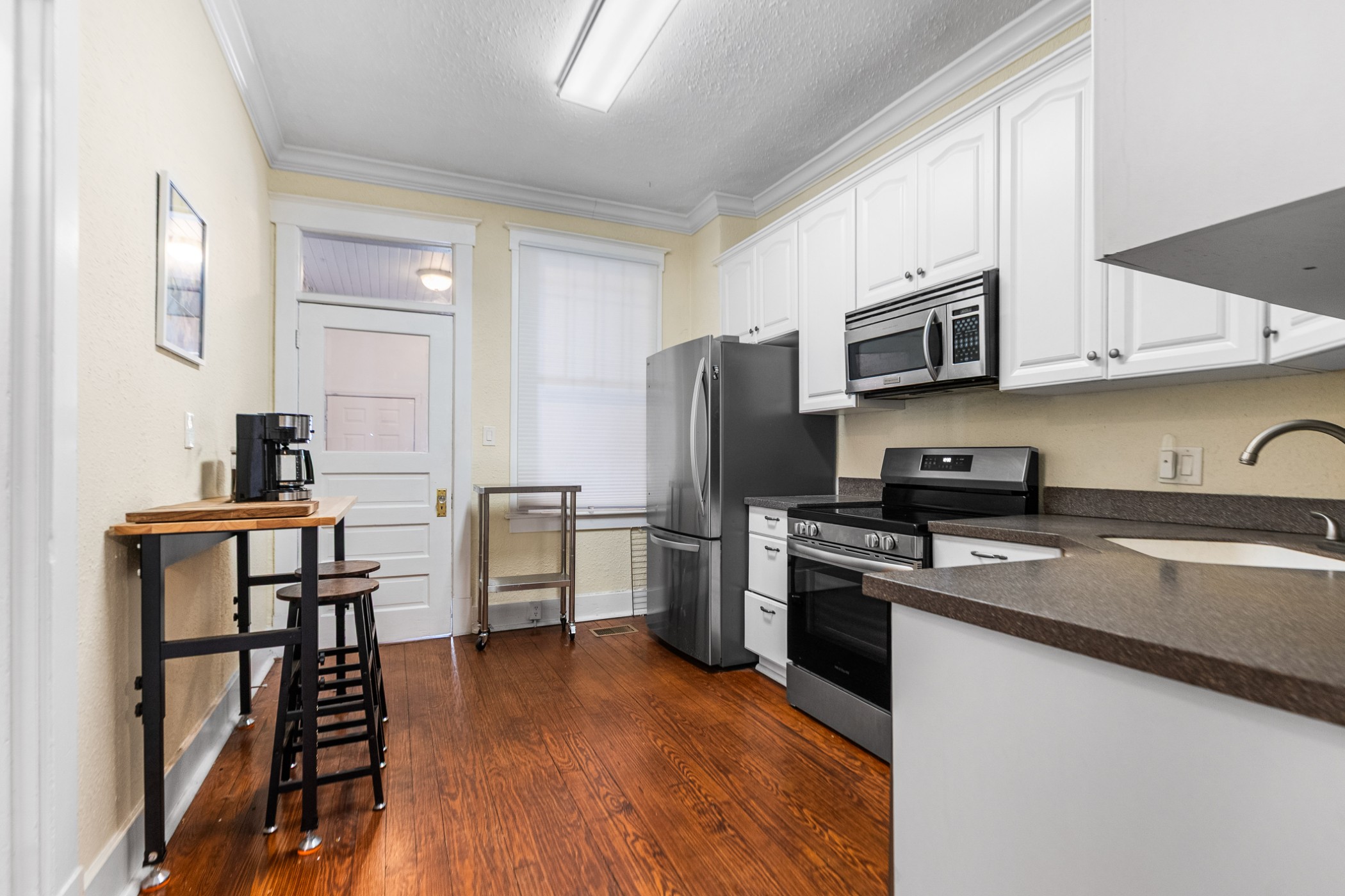 Built in 1923 with traditional craftsmanship, this classic structure has both presence and practicality. The masonry exterior and symmetrical design have aged with remarkable grace, offering a sense of history without sacrificing relevance. Preserved transoms, crown molding, and tall ceilings enhance the unit's architectural depth, complemented by hardwood floors, a renovated bath with a newly installed shower, generous storage, and a large-screened porch that extends the living area.